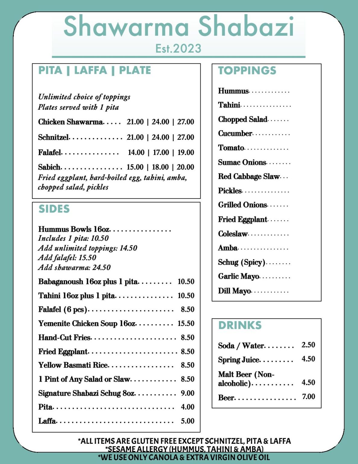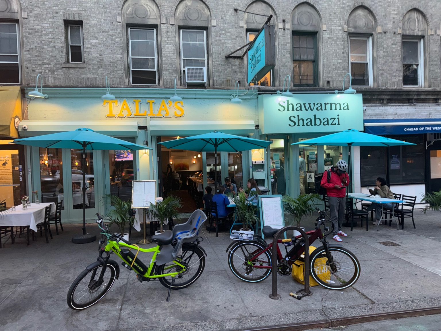 Shawarma Shabazi was created mainly for takeout and deliveries with outdoor seating only and with no wait service. However, if seats are available inside the premises of Talia’s Steakhouse, which is next door, we allow Shabazi customers to dine at Talia’s but, again, there is no wait service for Shabazi diners. Shawarma Shabazi is perfect for late night diners!